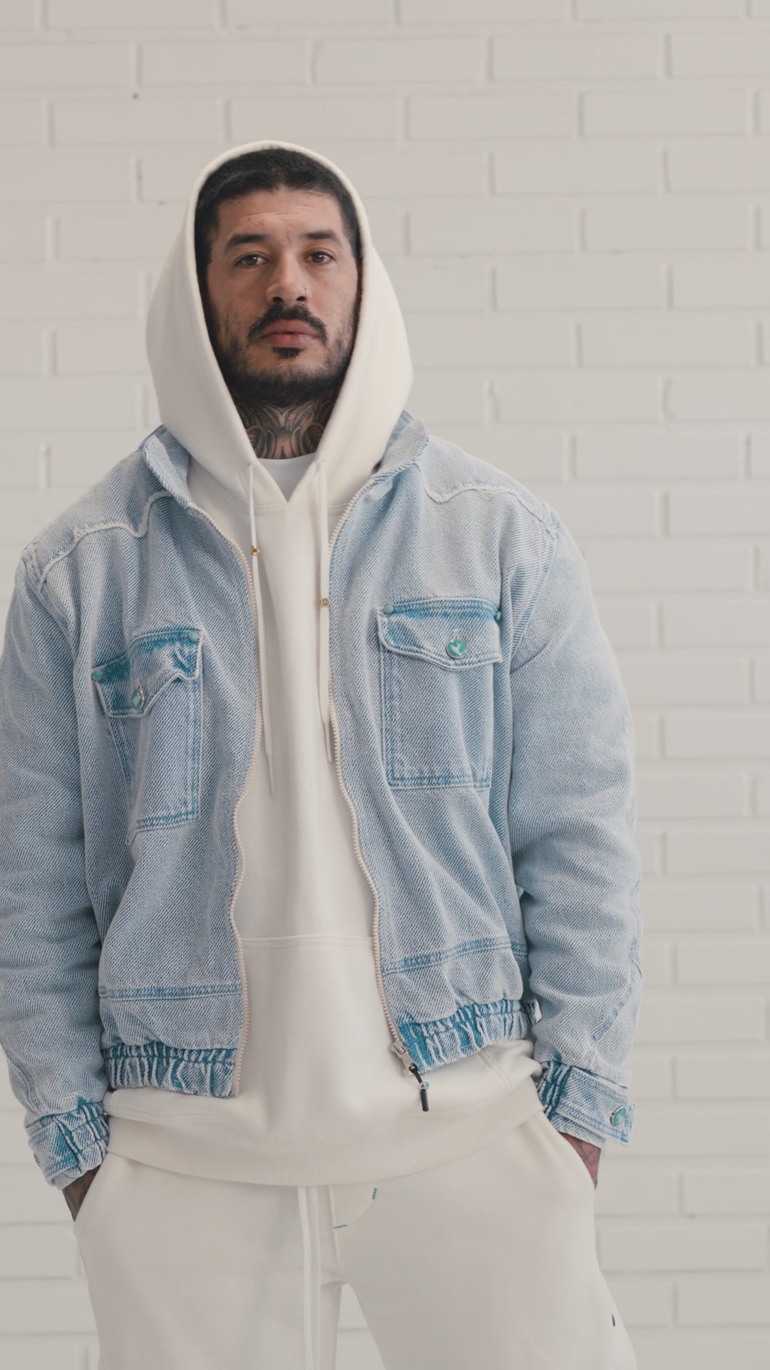 A Jacket Jeans Cowboy Vintage Blue é uma jaqueta em jeans 100% algodão, sendo a opção mais leve entre as jaquetas jeans, perfeita para o inverno ou para os períodos de meia-estação. Com fechamento em zíper, a peça se destaca pelos detalhes aplicados em jeans na pala das costas e da frente, com acabamento desfiado. A jaqueta conta com dois bolsos frontais espaçosos, com fechamento em lapela e botões flexíveis, todos na cor azul turquesa, fazendo referência ao tema da coleção. Nas costas, exibe uma estampa termocolante E`C. branca em alto relevo, complementando o design.