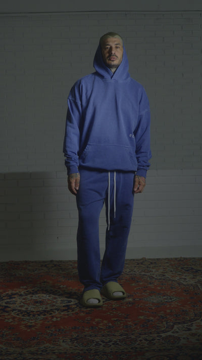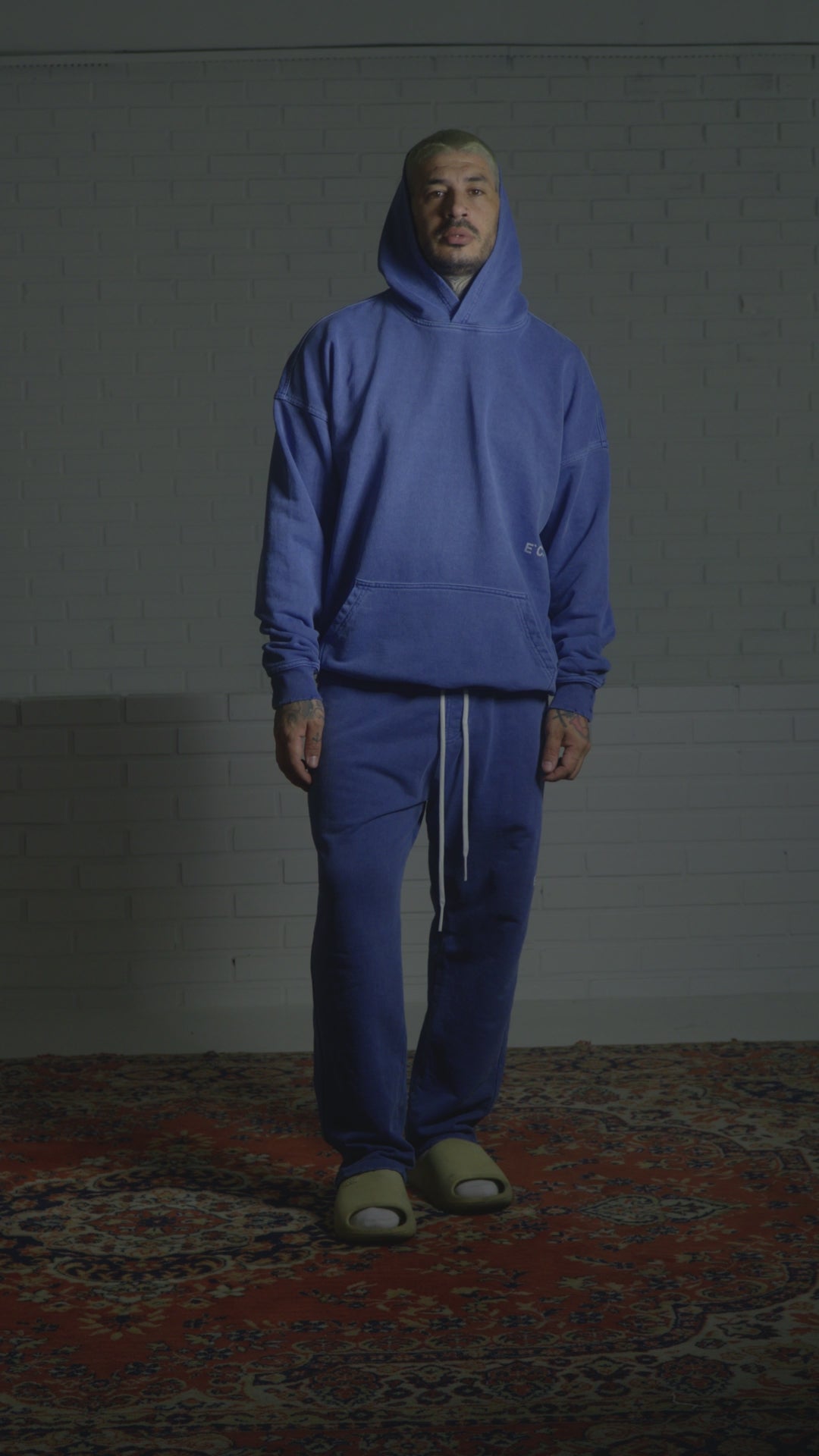 A Standard Sweatpants Washed Blue é uma calça confeccionada em moletom 3 cabos, com tingimento e puído realizado em lavanderia, resultando em um visual com aspecto estonado. Possui dois bolsos frontais estilo faca e um bolso traseiro, além de cós com elástico e ajuste em cordão branco. Na parte da frente temos uma estampa E`C. em termocolante.