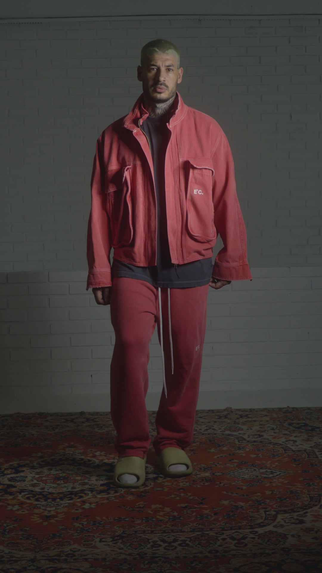 A Trucker Jacket Washed Red é confeccionada em sarja Vicunha 100% algodão, com tingimento e puído em lavanderia que garante um visual único e acabamento estonado. A peça conta com bolsos cargo frontais duplos que reforçam sua proposta utilitária, forro interno em malha leve para maior conforto ao vestir, barra com elástico e fechamento em zíper de metal, além de puxador. Na parte da frente temos uma estampa em termocolante E`C. branca, enquanto nas costas, em serigrafia com aspecto envelhecido, uma estampa branca Lovers e o mascote da coleção, na parte superior uma termocolante preta E`C. vazada.