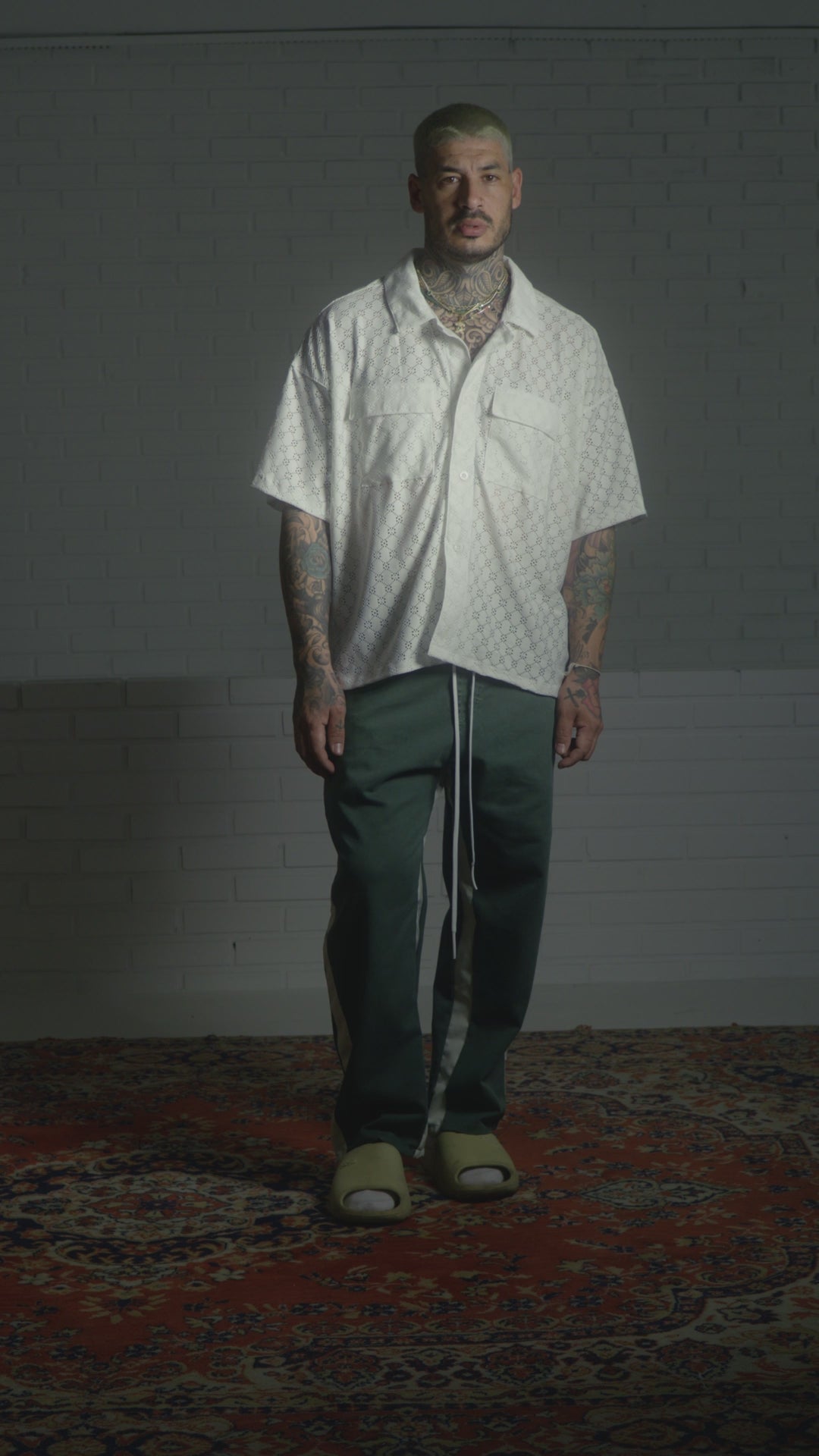 A Twill Pants Green é uma calça de sarja 100% algodão, tingida em lavanderia e com faixas laterais, o que confere à peça um aspecto estonado e cheio de personalidade. Conta com dois bolsos frontais e um bolso traseiro. Sua modelagem oversized de corte reto garante conforto e um caimento moderno, enquanto o cós elástico com ajuste por cordão proporciona praticidade no dia a dia. Na frente temos uma termocolante E`C. na cor branca que remete ao nome da marca.