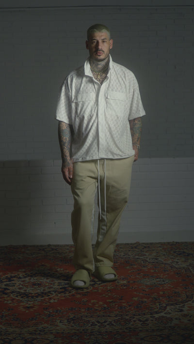 A Twill Pants Sand é uma calça de sarja 100% algodão, tingida em lavanderia com faixas brancas na lateral, o que confere à peça um aspecto estonado e cheio de personalidade. Conta com dois bolsos frontais e um bolso traseiro. Sua modelagem oversized de corte reto garante conforto e um caimento moderno, enquanto o cós elástico com ajuste por cordão proporciona praticidade no dia a dia. Na frente temos uma termocolante E`C. na cor branca que remete ao nome da marca.