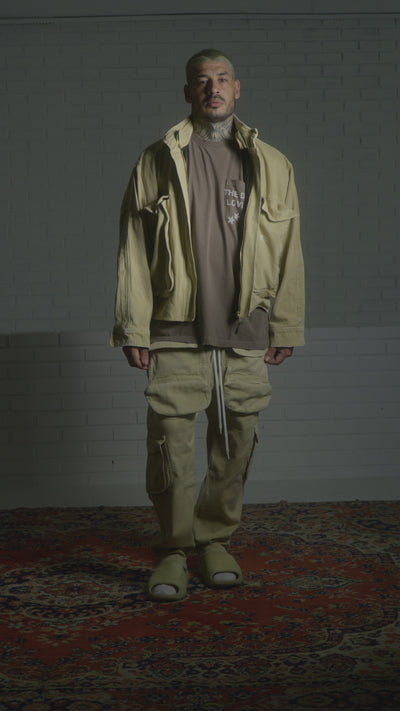 A Trucker Jacket Washed Beige é confeccionada em sarja Vicunha 100% algodão, com tingimento e puído em lavanderia que garante um visual único e acabamento estonado. A peça conta com bolsos cargo frontais duplos que reforçam sua proposta utilitária, forro interno em malha leve para maior conforto ao vestir, barra com elástico e fechamento em zíper de metal, além de puxador. Na parte da frente temos uma estampa em termocolante E`C. branca, enquanto nas costas, em serigrafia com aspecto envelhecido, uma estampa branca Lovers e o mascote da coleção, na parte superior uma termocolante preta E`C. vazada.
